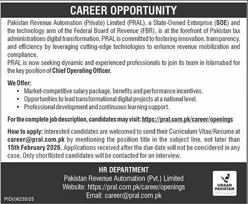 Candidates, if you are seeking the Career Opportunities at Pakistan Revenue Automation Private Limited 2026 if yes. It would be best if you tried to complete read thisCareer Opportunities Pakistan Revenue Automation Jobs because you can easily apply for the Chief Operating Officer.