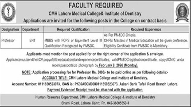 Candidates, if you are seeking the CMH Lahore Medical College Career Opportunity 2026, Apply Now if yes. It would be best if you tried to complete reading this CMH Lahore Medical College Jobs because you can easily apply for this vacancy as a Professor.