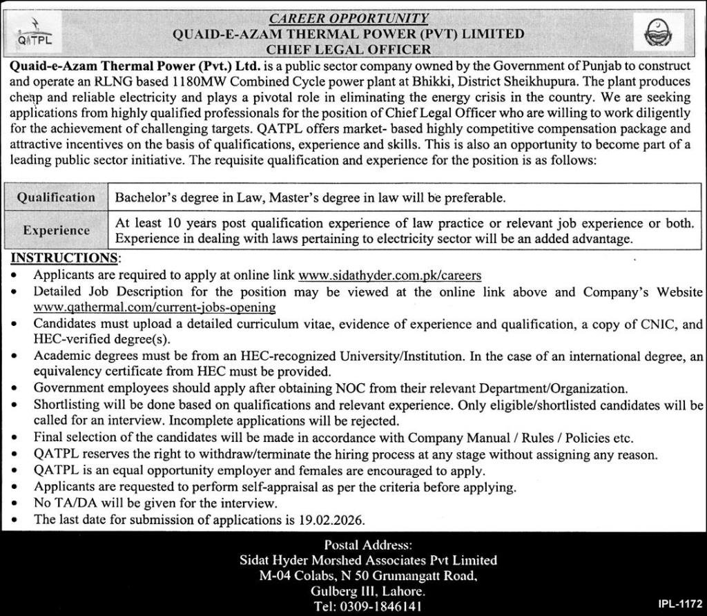 Candidates, if you are seeking the Quaid-e-Azam Thermal Power Pvt Ltd Career Opportunities 2026 if yes. It would be best if you tried to complete reading this Quaid-e-Azam Thermal Power Pvt Ltd 2026 because you can easily apply for the Chief Legal Officer.